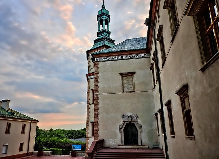 Zamek Biskupów Krakowskich jest obecnie główną siedzibą Muzeum Narodowego. Należał niegdyś do biskupów krakowskich, właścicieli rozległych dóbr świętokrzyskich. Rezydencję biskupów ufundował Jakub Zadzik w latach 1627-1635 podkanclerzy i kanclerz wielki koronny, biskup chełmiński, a od 1635 r. biskup krakowski. W latach 1637-1644 powstał piętrowy budynek nakryty wysokimi bliźniaczymi dachami z wieżami w narożach. Jego symetryczny, trójdzielny plan, loggie, wieże i układ reprezentacyjnych wnętrz nawiązują do rezydencji z lat 20. i 30. XVII w., w tym królewskich – Zamku Ujazdowskiego i Pałacu Kazimierzowskiego w Warszawie. Przed pałacem znajdował się dziedziniec zamknięty murami z paradną bramą od strony miasta, a z tyłu ogród ozdobno-użytkowy, zwany włoskim, z 4 kwaterami wypełnionymi ziołami oraz sadem, otoczony murem ze strzelnicami i 2 bastionami. Osiowość założenia na linii wschód-zachód (kolegiata - dziedziniec reprezentacyjny - pałac - ogród - baszta) miała oparcie widokowe we wzgórzu Karczówka i wzniesionym tam kościele. Płaska, bezporządkowa fasada pałacu ma podział trójdzielny, wyznaczony rytmem okien w obramieniach z piaskowca. Część środkową akcentuje loggia filarowa w oprawie z marmuru, której odpowiadają na piętrze wielkie okna reprezentacyjnej sieni. Nad arkadami loggii widnieją kamienne kartusze z herbami. Po bokach znajdują się odsunięte od korpusu sześcioboczne wieże nakryte ażurowymi hełmami i połączone z nim parawanowymi ścianami zwieńczonymi obeliskami, z bramkami prowadzącymi na boczne dziedzińczyki. Elewacja tylna, choć skromniejsza, również powtarza układ fasady - z loggią i prostymi niegdyś schodami prowadzącymi do ogrodu.